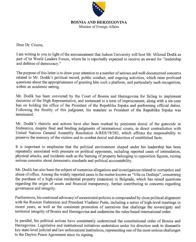 U svjetlu navedenog, s poštovanjem vas pozivam da pažljivo razmotrite i instituciju i platformu koju predstavljate, uzimajući u obzir potencijalni uticaj na kredibilitet i reputaciju vaše institucije”, zaključio je ministar vanjskih poslova BiH, Elmedin Konaković u pismu upućenom Gene Crumeu Jr. predsjedniku Judson Univerziteta u SAD.