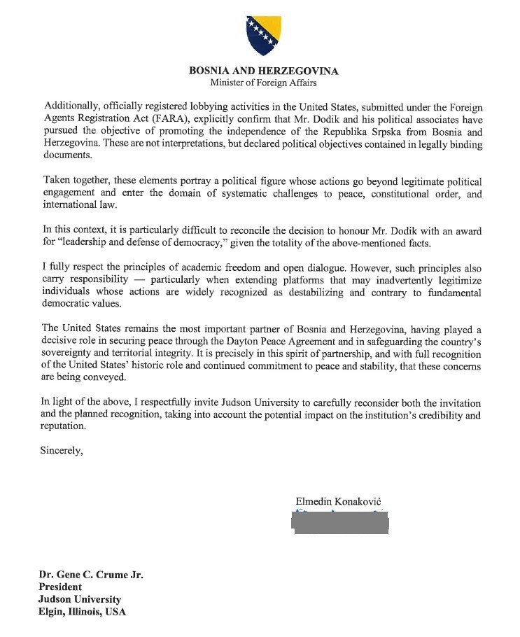 Ministar vanjskih poslova BiH Elmedin Konaković, uputio je pismo predsjedniku Judson Univerziteta u Sjedinjenim Američkim Državama, Gene Crumeu Jr., povodom najave da će ova američka visokoškolska institucija ugostiti 30. aprila Milorada Dodika na World Leaders Forumu 2026, gdje mu je planirano i uručenje nagrade za ‘liderstvo i odbranu demokratije’, saznaje Raport.
