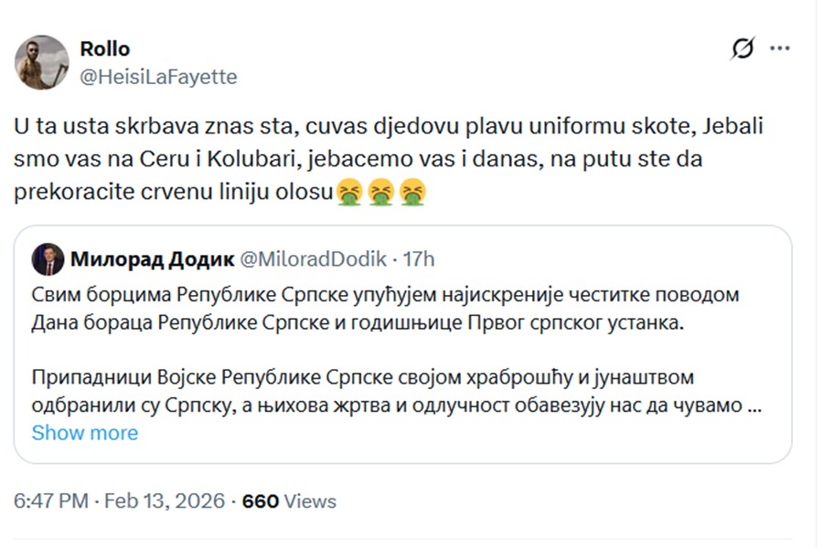 Poruku Miloradu Dodiku podijelio je na društvenim mrežama i beogradski profesor Ivan Videnović, koji je u više navrata za “Slobodnu Bosnu” govorio o Miloradu Dodiku i njegovoj politici.