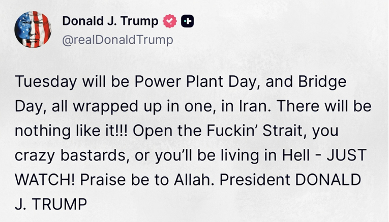 Američki predsjednik na svojoj je platformi Truth Social napisao: “U utorak je u Iranu Dan elektrana i Dan mostova, sve u jednom. Takvo što još nije viđeno!!! Otvorite taj je.eni prolaz, vi ludi gadovi, ili ćete živjeti u paklu – SAMO GLEDAJTE! Slava Allahu. Predsjednik DONALD J. TRUMP.”