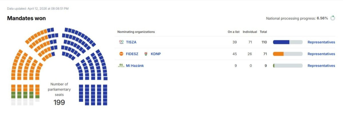 Prema tim podacima, opozicioni blok Tisa, predvođen Peterom Mađarom, osvaja 110 mandata, dok stranka aktuelnog premijera Viktora Orbana, Fides, ima 71 mandat.