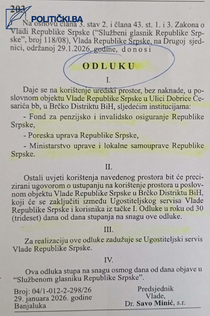 Vlada entiteta Rs odlučila je u Brčko Distriktu otvoriti svoje urede za penzijsko-invalidsko osiguranje, poreze, ali i kancelariju Ministarstva uprave i lokalne samouprave tog entiteta, javlja Politicki.ba.