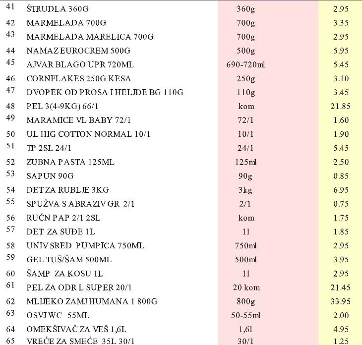 Ministarstvo trgovine Federacije BiH objavilo je listu od 65 prehrambenih i higijenskih proizvoda čije su cijene snižene i zaključane u okviru petog vala projekta regulacije cijena.