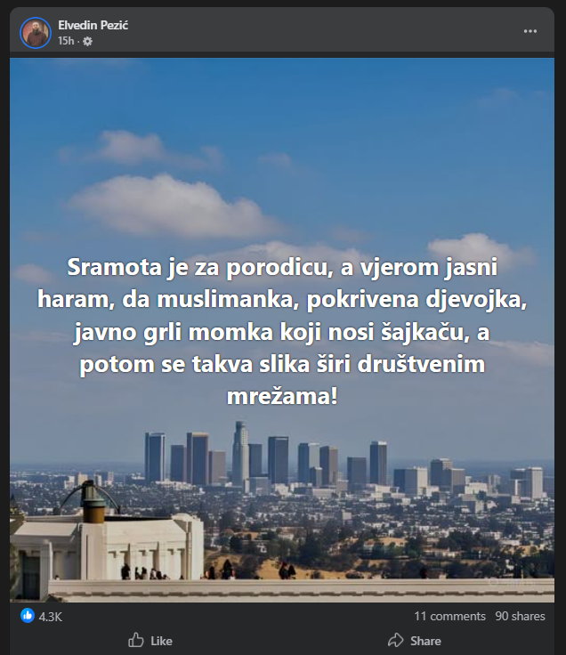 „Sramota je za porodicu, a vjerom jasno haram, da muslimanka, pokrivena djevojka, javno grli momka koji nosi šajkaču, a potom se takva slika širi društvenim mrežama“, napisao je Pezić.