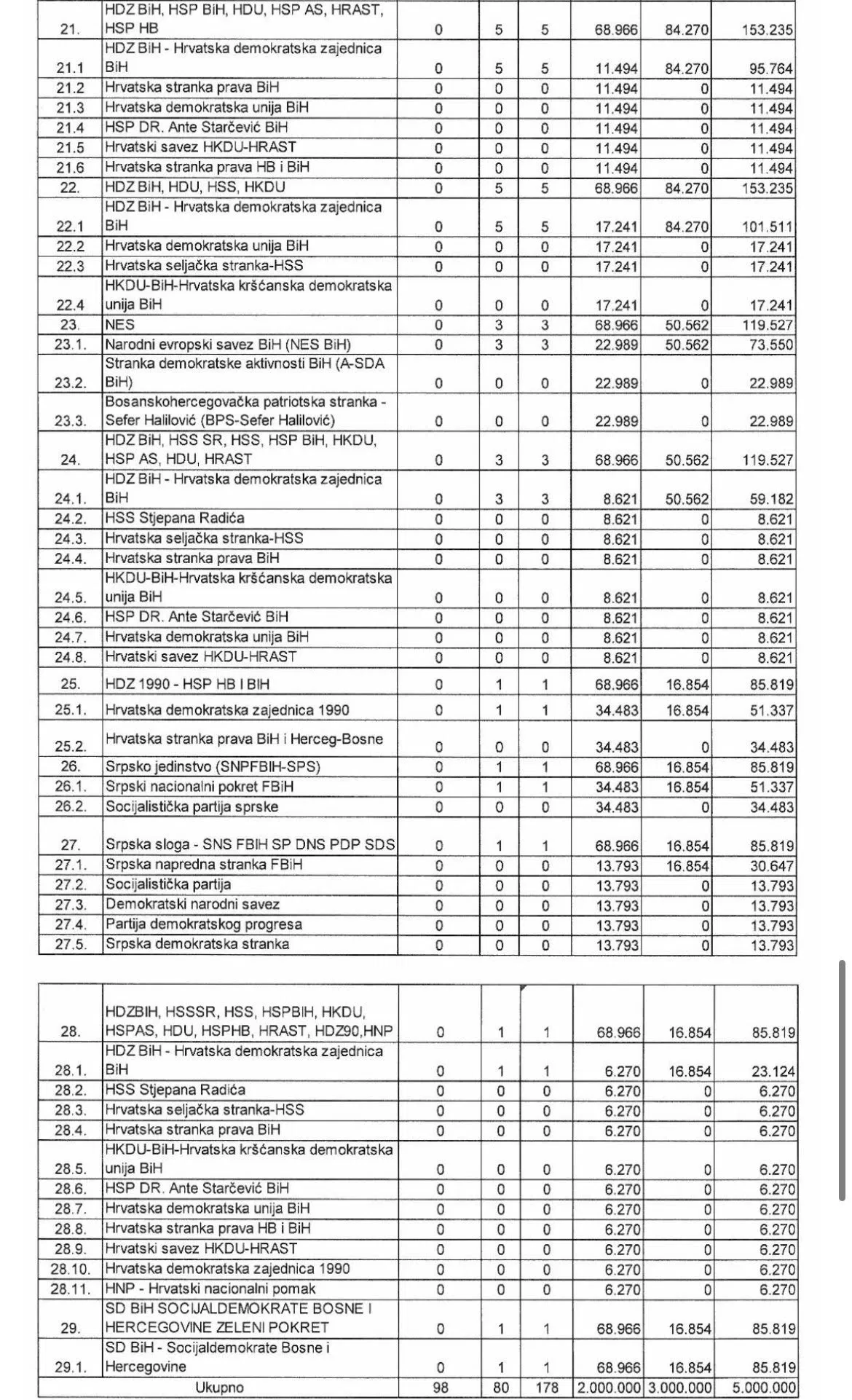 U nastavku donosimo tabelu s iznosima koji su dodijeljeni strankama: