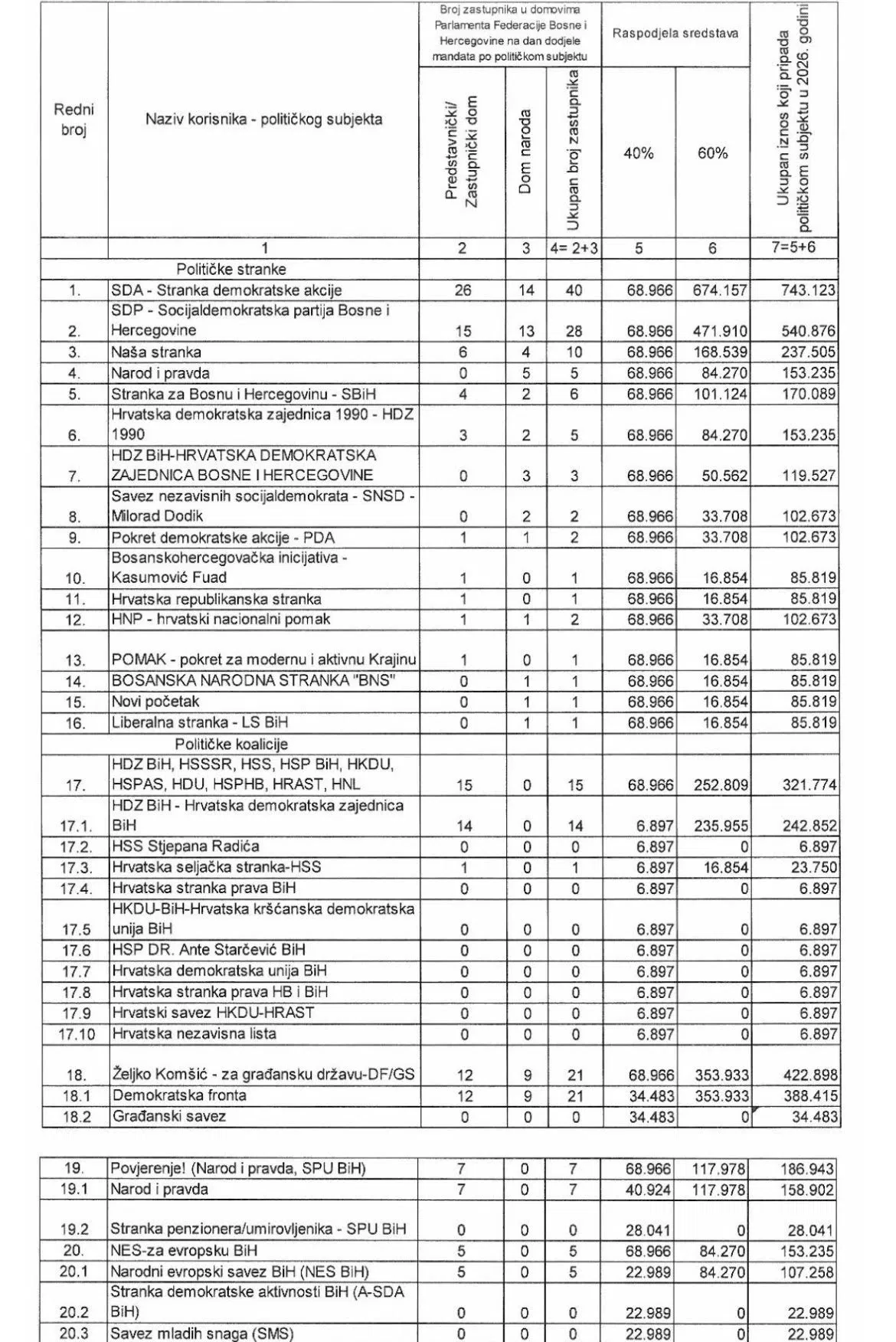 Vlada FBiH pozvala se na član 23. Zakona o izvršavanju Budžeta za 2026. godinu. Na prvom mjestu tabele je SDA koja je dobila 743.123 KM. HDZBiH je u tabeli zastupljen više puta, kao stranka ali i kao član određenih koalicija.