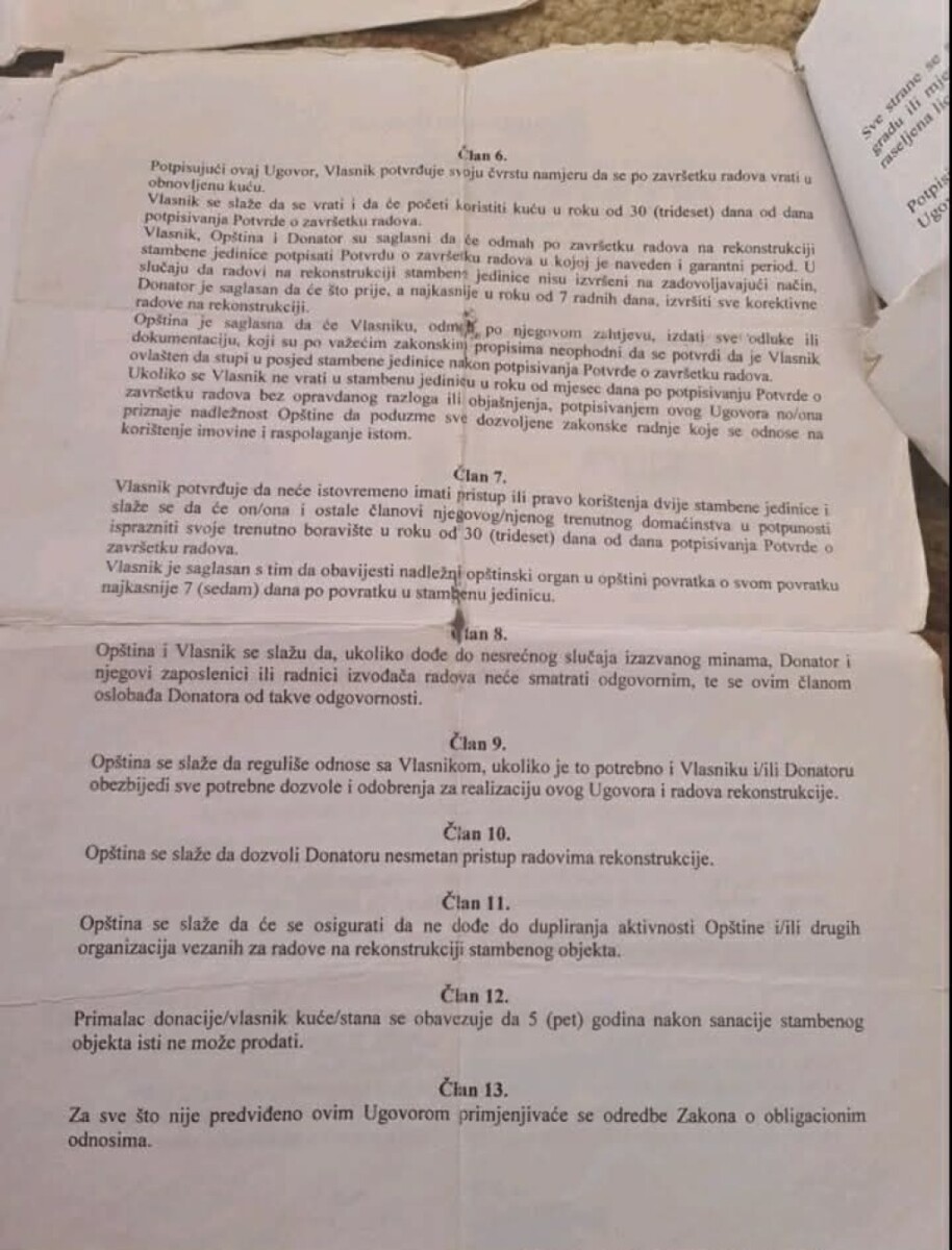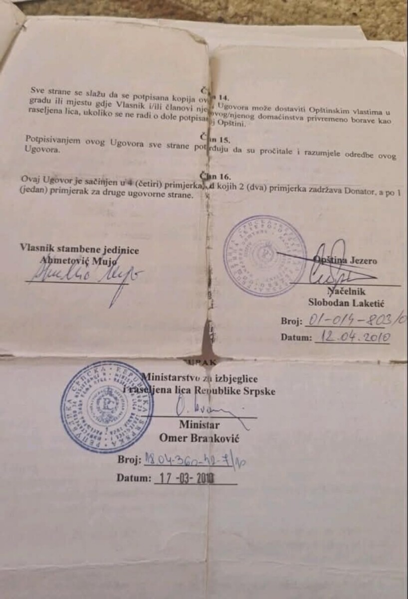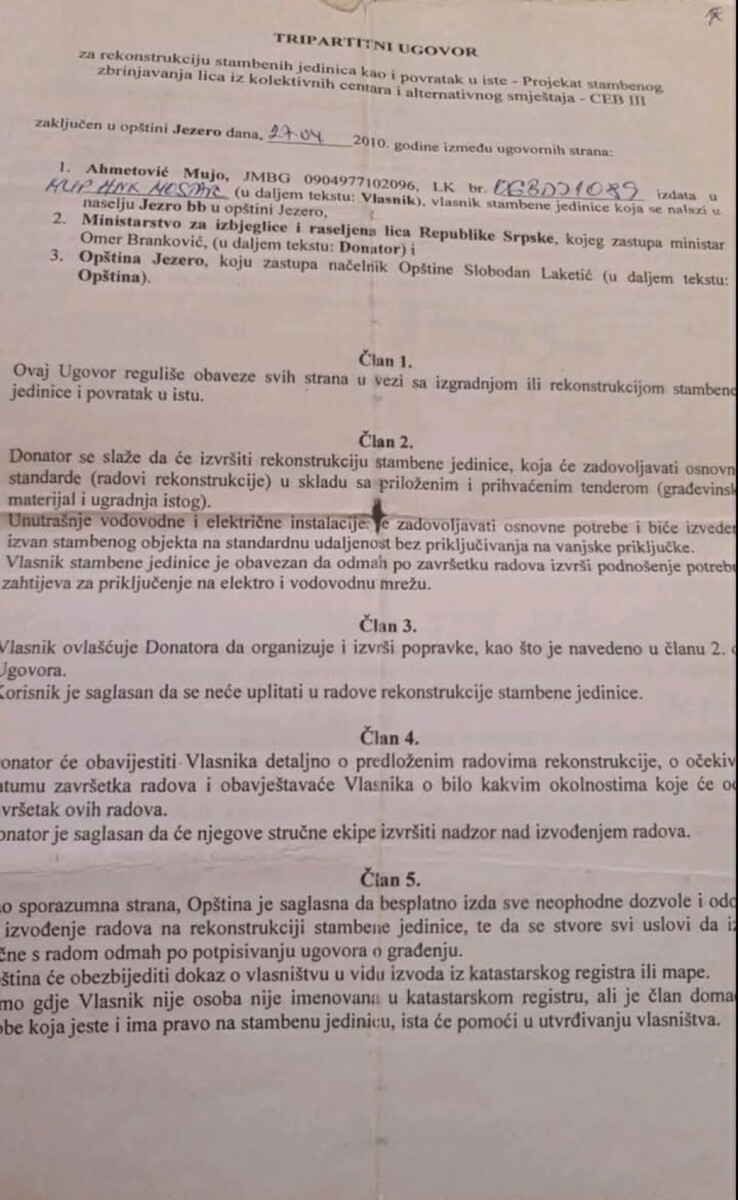 Iz dostupne dokumentacije proizlazi da je kuća obnovljena na osnovu važećeg tripartitnog ugovora iz 2010. godine, koji su potpisali Mujo Ahmetović, Ministarstvo za izbjeglice i raseljene osobe RS-a i Općina Jezero. Tim ugovorom je jasno definisano da se radi o povratku u vlastiti dom, a općina se obavezala da osigura potrebne dozvole i pomogne u utvrđivanju vlasništva.