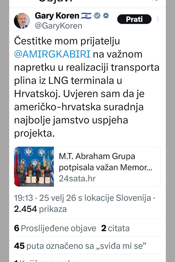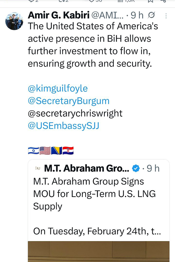 Memorandum o razumijevanju, koji je potpisala kompanija iza koje stoji Amir Gross Kabiri, prijatelj lidera HDZ-a BiH Dragana Čovića, a odnosi se na buduću isporuku američkog LNG-a putem projekta Južna interkonekcija. Međutim, Južna interkonekcija još nije izgrađena.