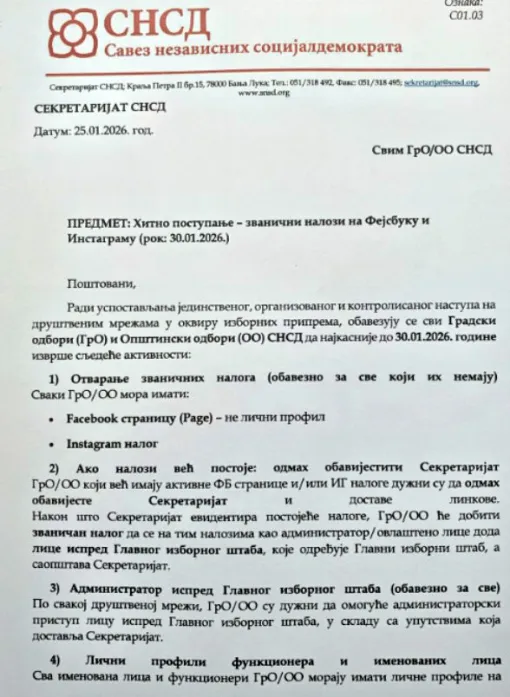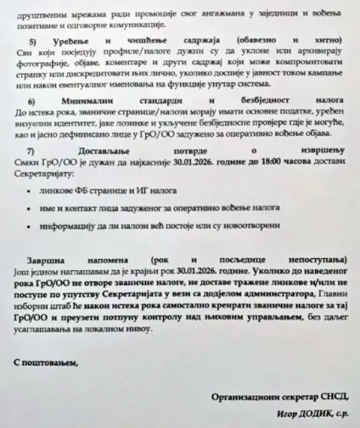 “Radi uspostavljanja jedinstvenog, organizovanog i kontrolisanog nastupa na društvenim mrežama u okviru izbornih priprema, obavezuju se svi Gradski odbori (GrO) i Opštinski odbori (OO) SNSD da najkasnije do 30.01.2026. godine izvrše sljedeće aktivnosti:
