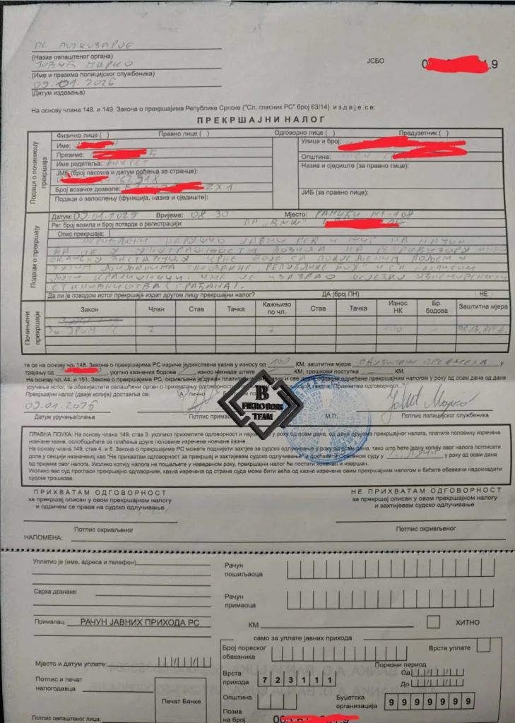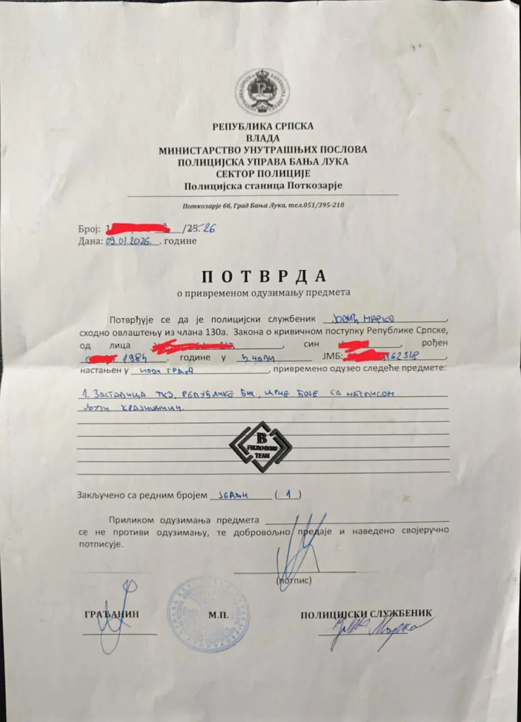 Vozač koji je jutros zaustavljen na ulazu u Banja Luka tvrdi da mu je Policija RS napisala prekršajnu prijavu i oduzela amblem s ljiljanima, iako mu tokom kontrole nisu pronađene nikakve druge nepravilnosti. Kako navodi, zaustavljen je na magistralnom putu dok je bio na putu prema Tuzli, a kontrola je obavljena u prisustvu pet policajaca i dva policijska vozila.
