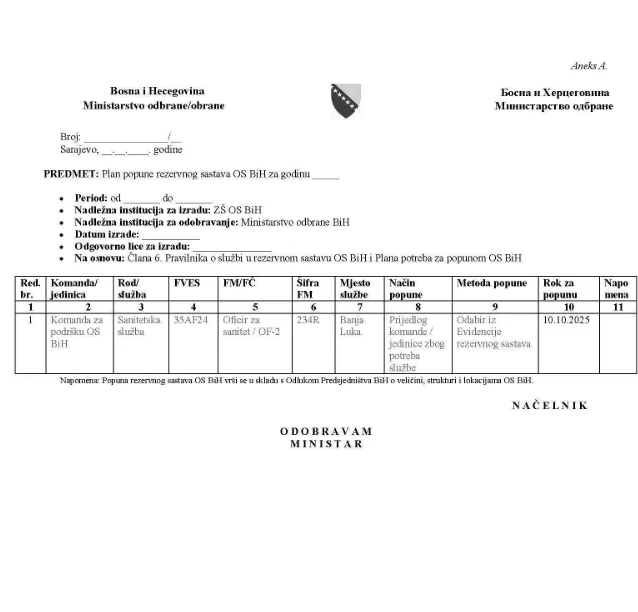Dodatno, formirat će se i Komisija za izbor koja će odlučiti ko će konkretno biti angažiran na zadacima određenim za rezervni sastav, nakon čega će izabrane osobe potpisati ugovor s Ministarstvom odbrane BiH o službi u rezervnom sastavu.