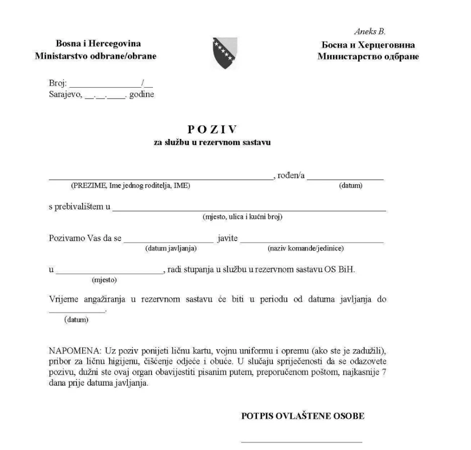 U Službenom glasniku Bosne i Hercegovine objavljen je Pravilnik o rezervnom sastavu Oružanih snaga BiH, kojim se uređuje način osiguranja finansijskih sredstava i opremanje, evidencija i aktiviranje rezervnog sastava, popuna rezervnog sastava i prijem lica u rezervni sastav.